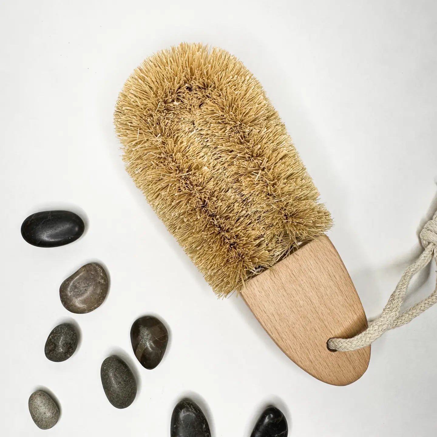 Plastic free, Natural coconut bristles multipurpose kitchen cleaning brush. Natural beechwood handle with cotton hanging rope.