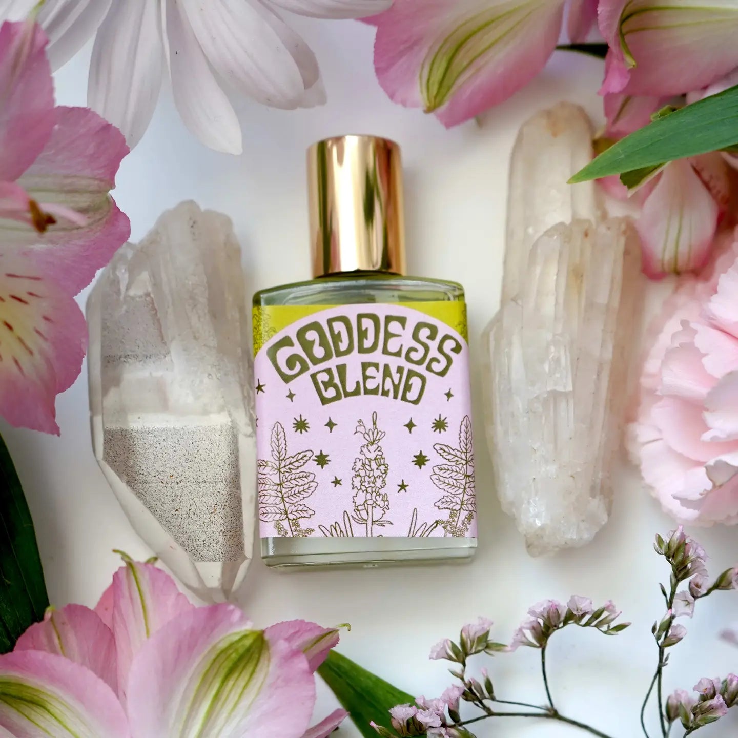Goddess Blend: Clary sage, frankincense, geranium, lavender, neroli, and jasmine essential oil, infused with grapeseed oil
